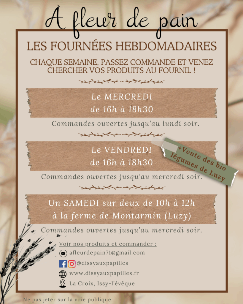 – Tous les mercredis et vendredis : retrait des commandes au fournil de 16h à 18h30. Les commandes sont ouvertes jusqu’au lundi soir pour la fournée du mercredi et jusqu’au mercredi soir pour la fournée du vendredi.