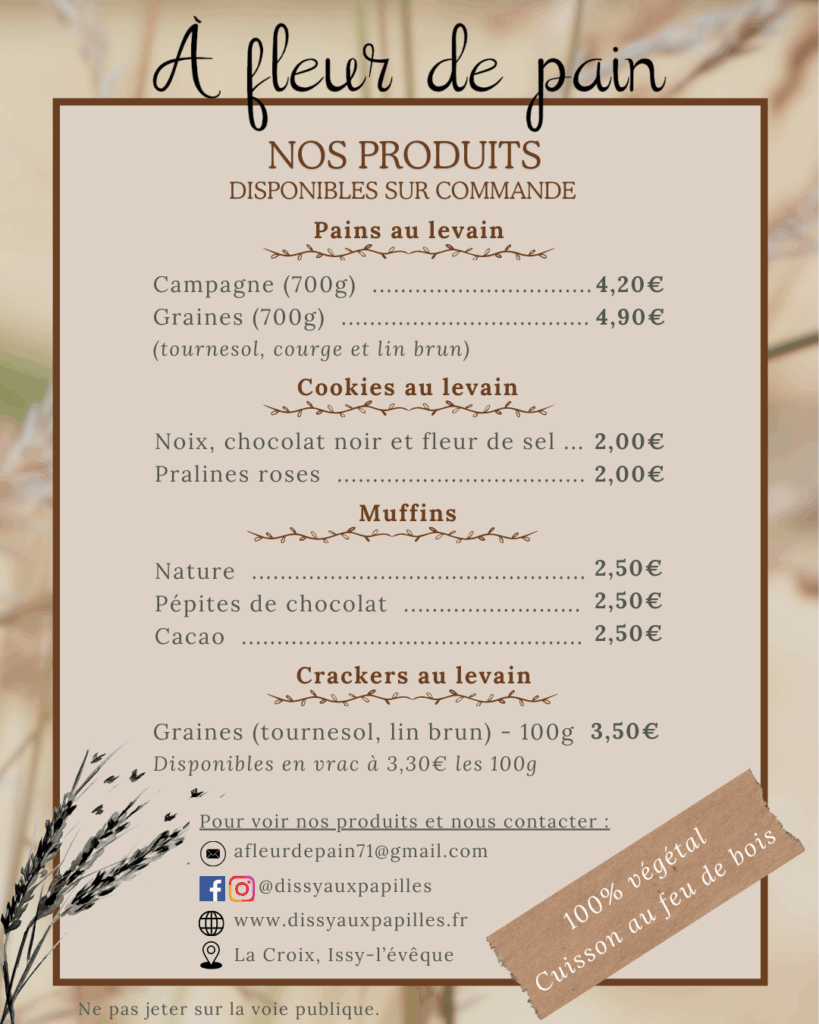 La majorité des produits n’est disponible que sur commande et en direct du fournil ou lors d’événements locaux. Pour avoir votre pain au levain, il vous faudra passer commande 48h avant le jour de la fournée et venir le chercher au fournil !