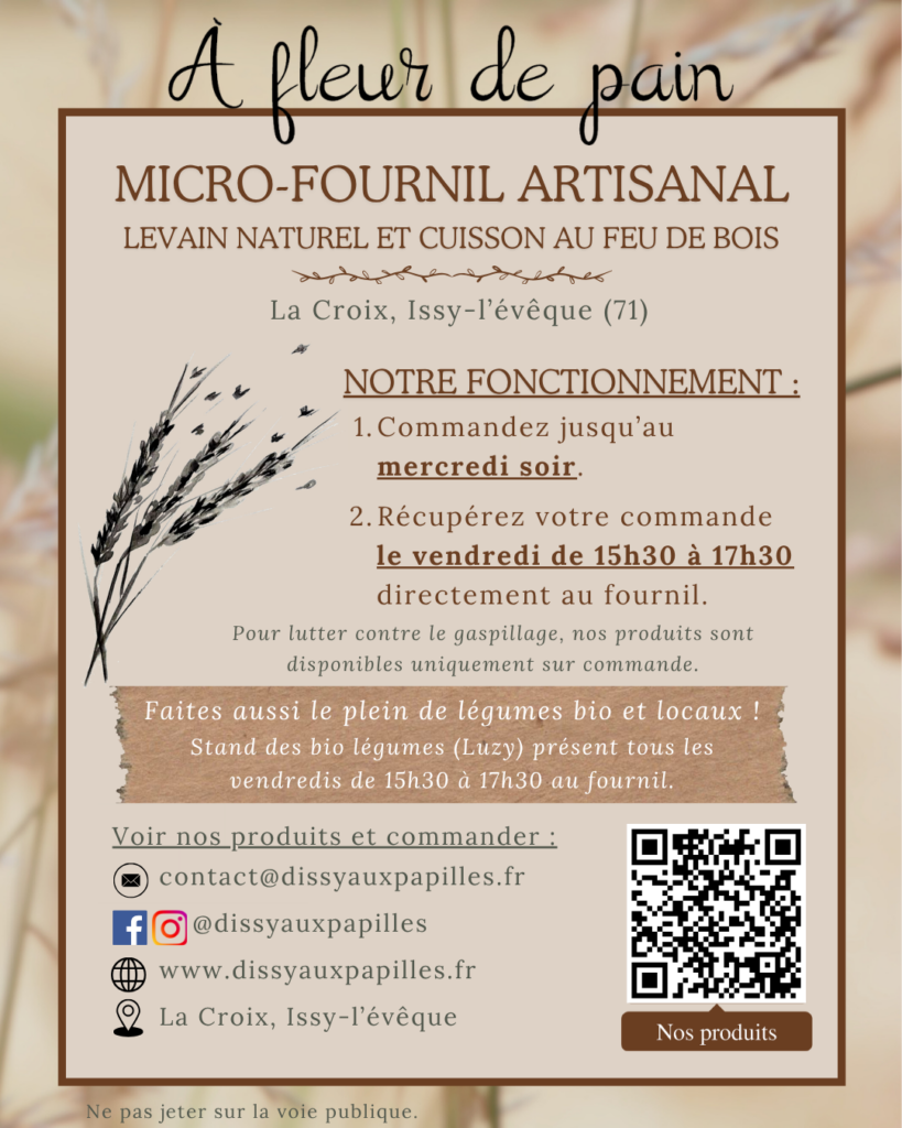 À fleur de pain, c’est un micro-fournil installé à Issy-l’évêque (71) où tout est fait à la main ! Ici le pétrin est en bois de hêtre, les pains sont 100% levain et les cuissons se font au feu de bois. La farine est une farine de blé semi-complète, 100% bio et locale, en provenance du moulin de Briffaud de Neuvy-Grandchamp (71).